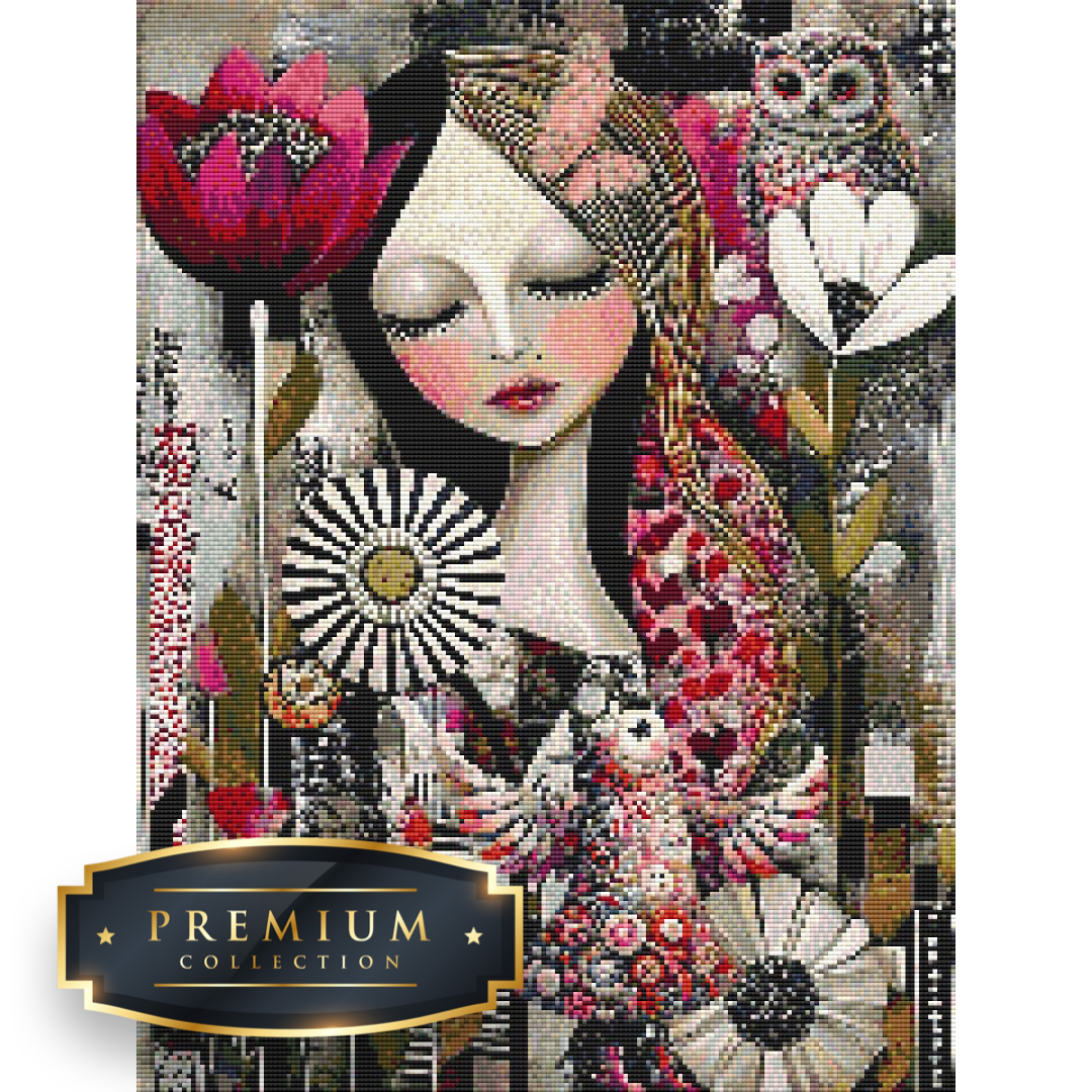 Dit diamond painting pakket van een artistieke dame bevat een duidelijk leesbaar canvas met volledige bedekking en vierkante steentjes, die overigens al voorgesorteerd in cupjes worden geleverd.