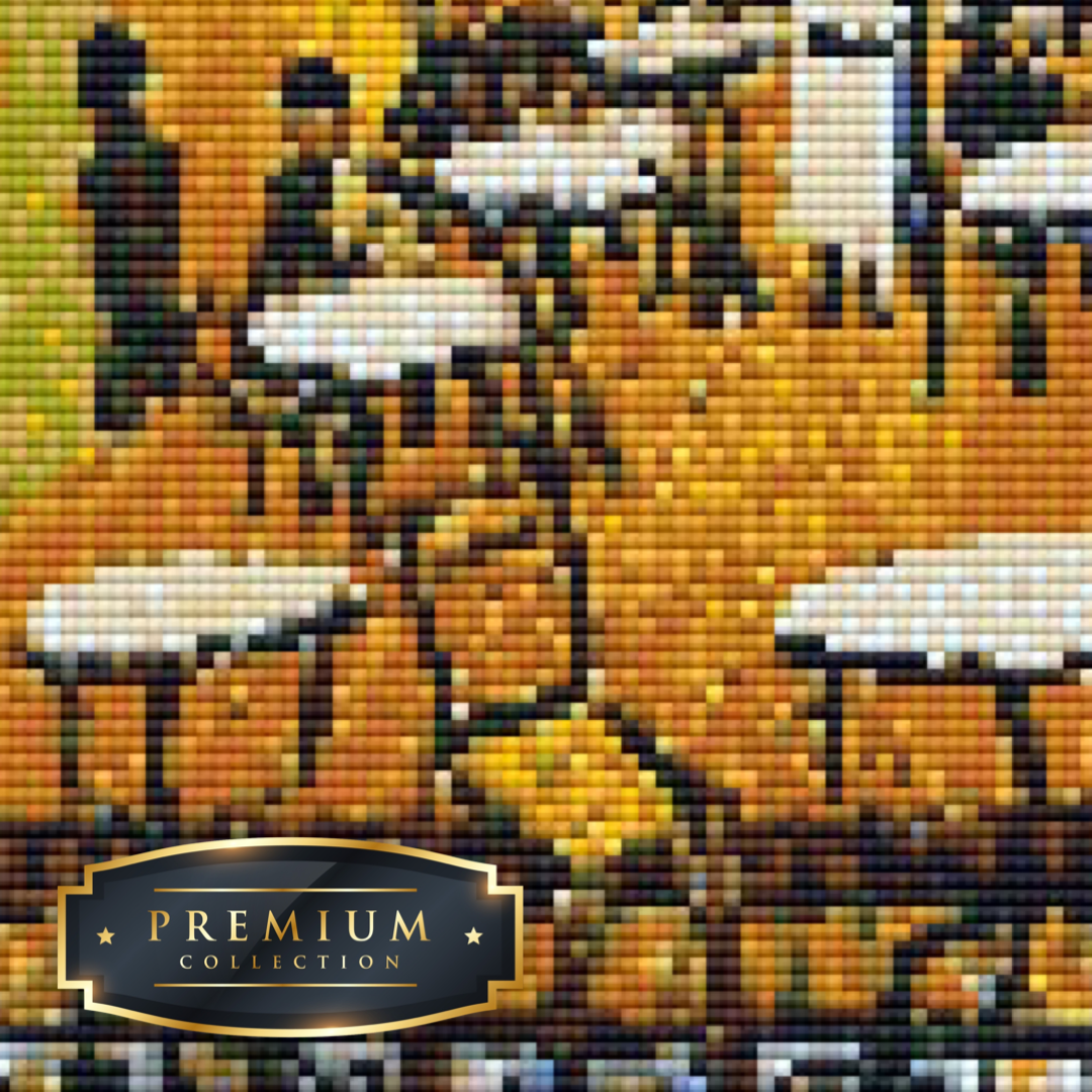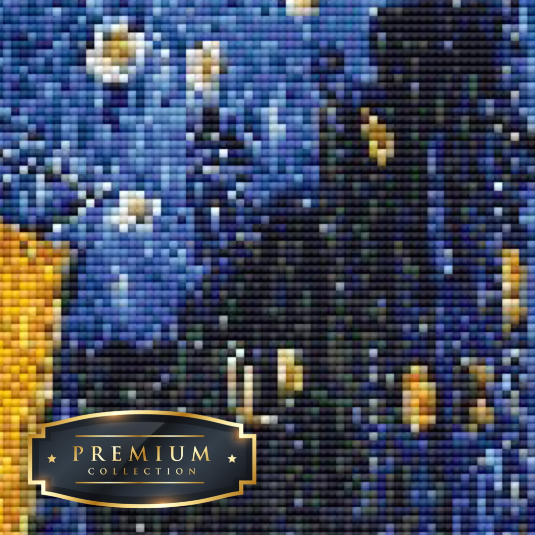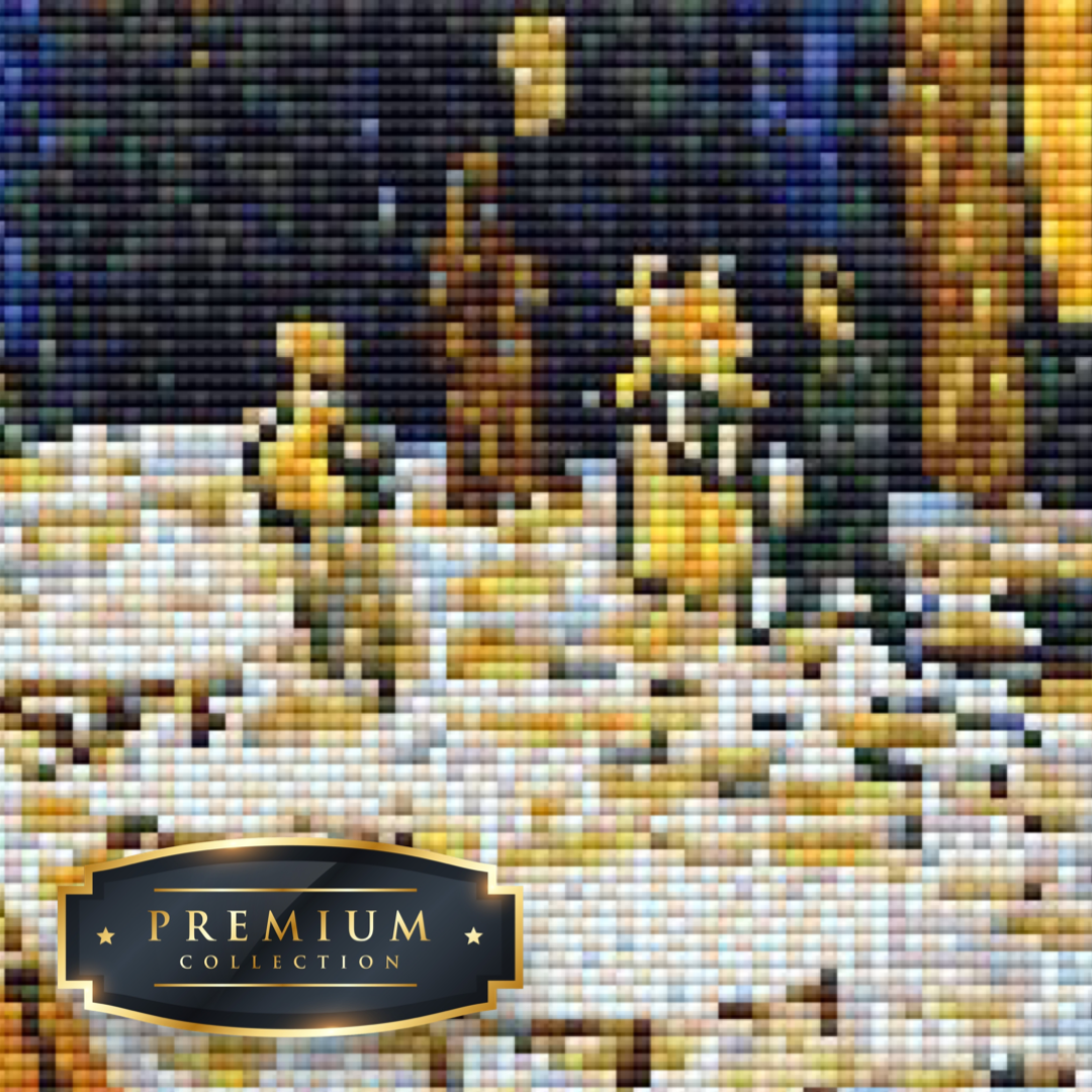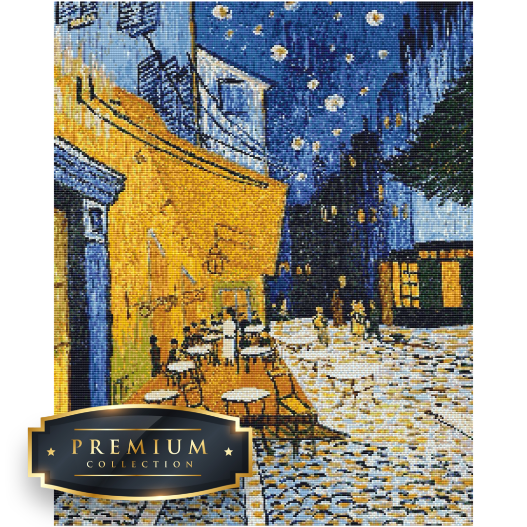 Dit diamond painting pakket van het schilderij Caféterras van Vincent van Gogh bevat een duidelijk leesbaar canvas met volledige bedekking en vierkante steentjes, die overigens al voorgesorteerd in cupjes worden geleverd.